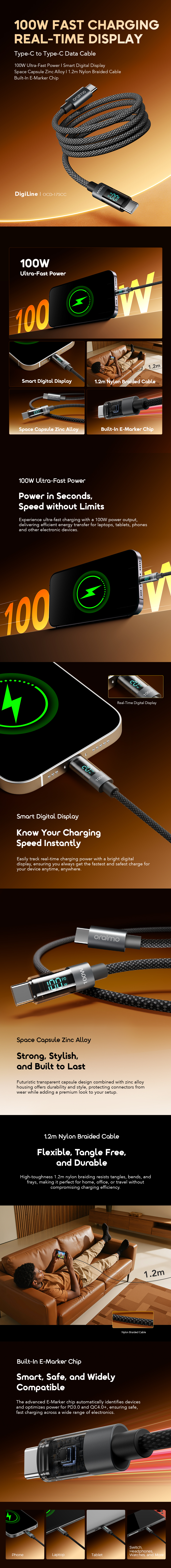 Type: Type‑C to Type‑C Power: 5A, 100W Max Transfer Rate: Up to 480 Mbps Input: Type‑C Output: Type‑C Length: 1.2 m *oraimo Lab test results